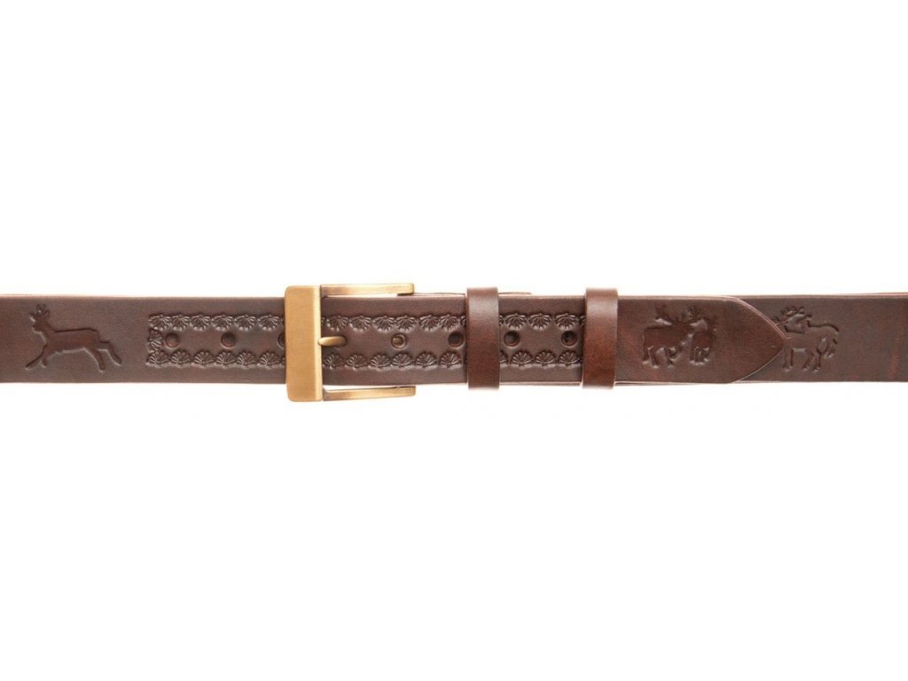 Myslivecký opasek z kvalitní kůže v hnědé a zelené barvě. Opasek zdobený ražením motivů zvěře. Zapínání pomocí jednoduché spony.